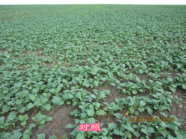 北方春油菜種植地區(qū)5月份普遍風(fēng)大,降雨偏少,土壤濕度不夠,經(jīng)常出現(xiàn)出苗少,苗不齊,抗旱能力較差的情況,嚴(yán)重年分苗子缺水死亡,經(jīng)多年綜合實(shí)驗(yàn)效果,利用皓達(dá)拌種能夠有效緩解這些情況。經(jīng)過(guò)皓達(dá)處理,苗期根系發(fā)達(dá),吸水能力強(qiáng),出苗整齊。(5月9日播種)