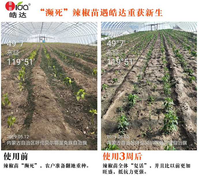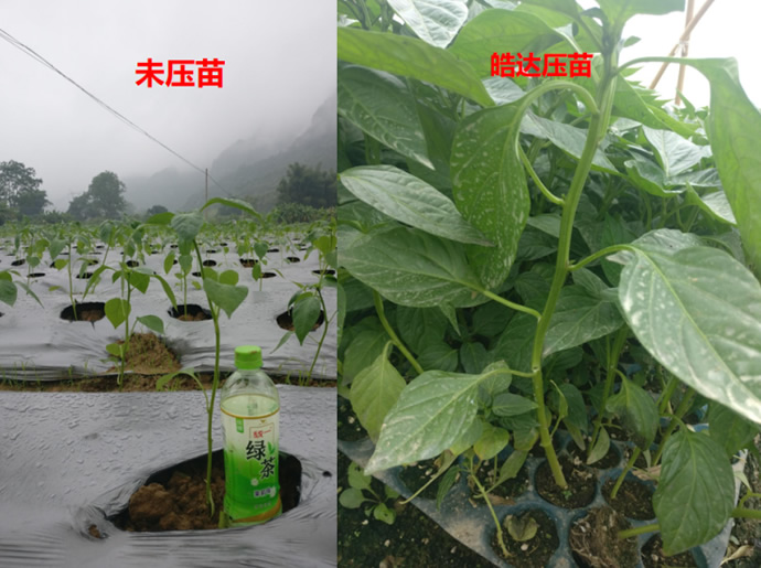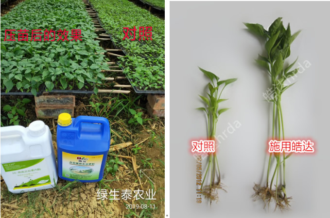 施肥時期:提苗生長期 時期問題: 植株不夠健壯,葉片發黃,根系差,莖桿細弱; 施肥方案:葉噴+滴灌(30斤水用量) 葉噴:皓達功能肥500-800倍(30-50mL)+磷酸二氫鉀800倍(30g) 淋根:皓達功能肥1kg/畝+大量元素水溶肥 施肥效果: 葉片厚綠,根系發達,促發新根,爛根少。