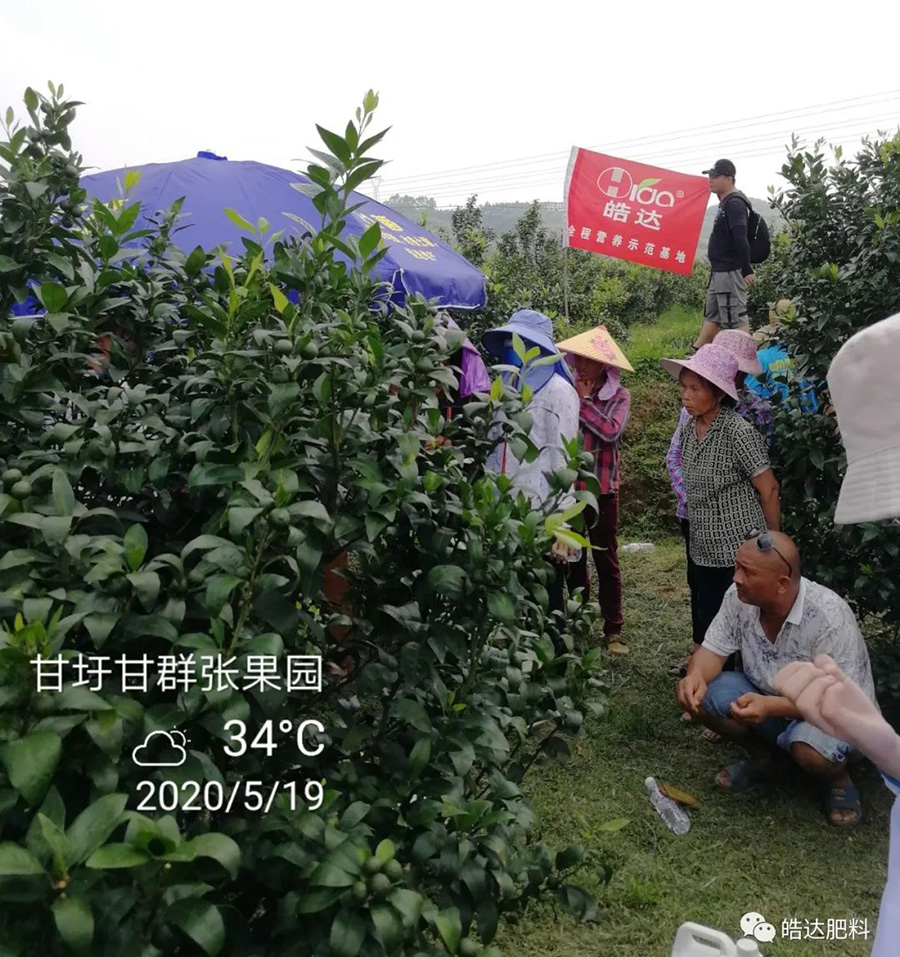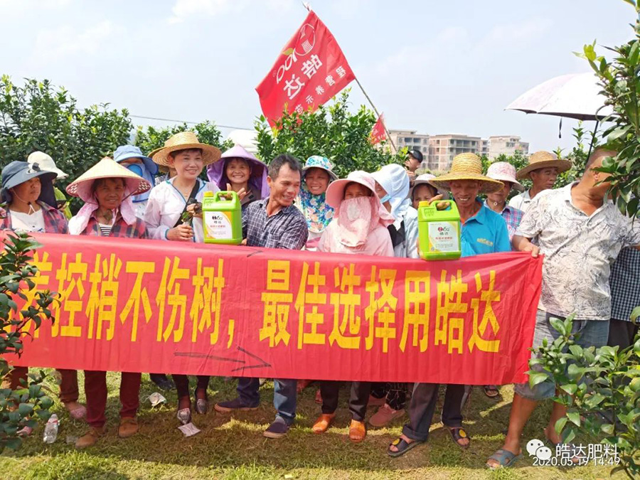 ?2020年5月19日,皓達農化服務團隊到了廣西武鳴甘圩地區,開展了柑橘示范觀摩會,地點在甘群張老板的果園里,甘老板用了皓達營養控梢保果方案之后,果園葉片厚綠、幼果膨大快,果量多,保果穩。