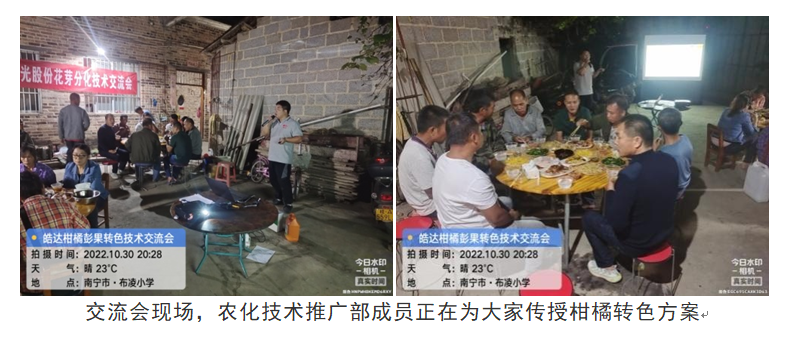 2022年10月30日,武漢皓達(dá)農(nóng)業(yè)科技有限公司農(nóng)化技術(shù)推廣部技術(shù)團(tuán)隊(duì)來到了廣西武鳴,這里的沃柑極其出名,“武鳴沃柑”更是南寧市第七件地理標(biāo)志商標(biāo),武鳴縣也是全國沃柑種植最大的縣區(qū)。在這里,皓達(dá)的產(chǎn)品被廣大柑橘種植戶使用和推廣,“轉(zhuǎn)色皓達(dá)應(yīng)用技術(shù)交流會(huì)”等交流會(huì)更是一場開了一場,我們積極參與同種植戶探討柑橘管理技術(shù)以及柑橘著色方案,讓廣大朋友們都能見到種出來的最靚、品質(zhì)最好的柑橘。