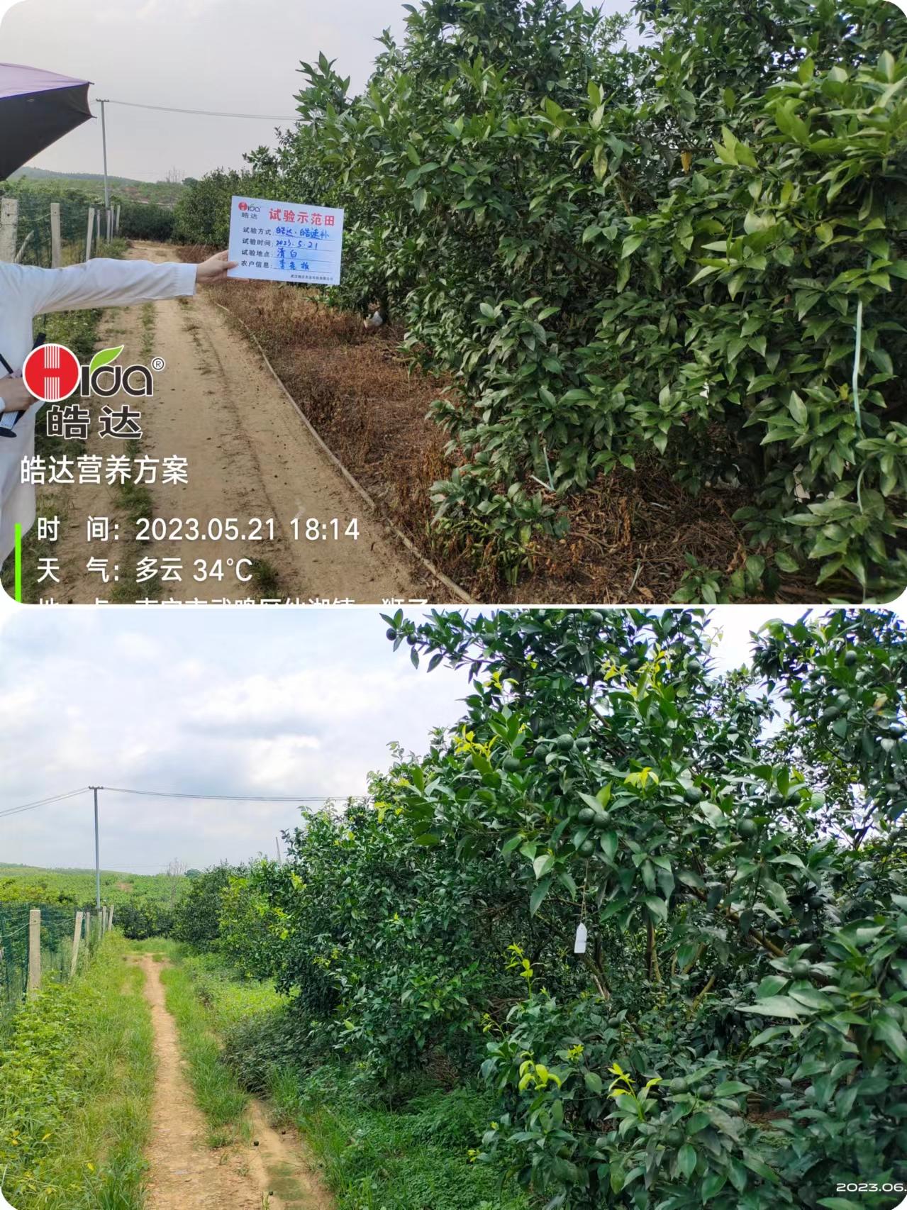 (23年5月21日全園未出夏梢,樹體弱,通過施用皓達兩次,6月樹體轉綠明顯,果實膨大明顯)