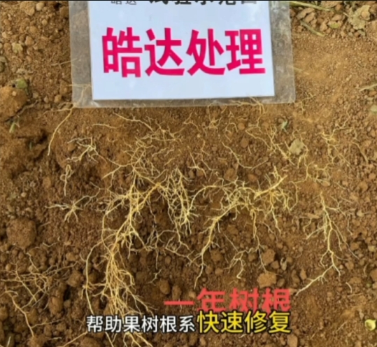 以上這些問題均可能阻礙果樹根系的生長,導致缺素黃化。為了解決這個問題,我們可以根據果樹根系的具體問題,配合農藥對根系進行修復。一般來說,根據果實的大小,可以使用皓達功能肥30-80毫升進行淋根,幫助果實根系快速修復,讓果樹根深葉茂。
