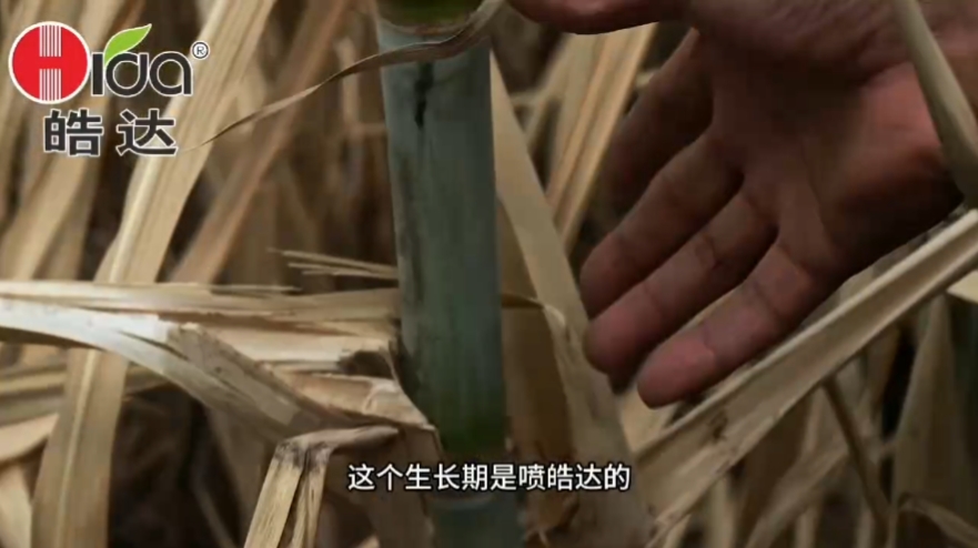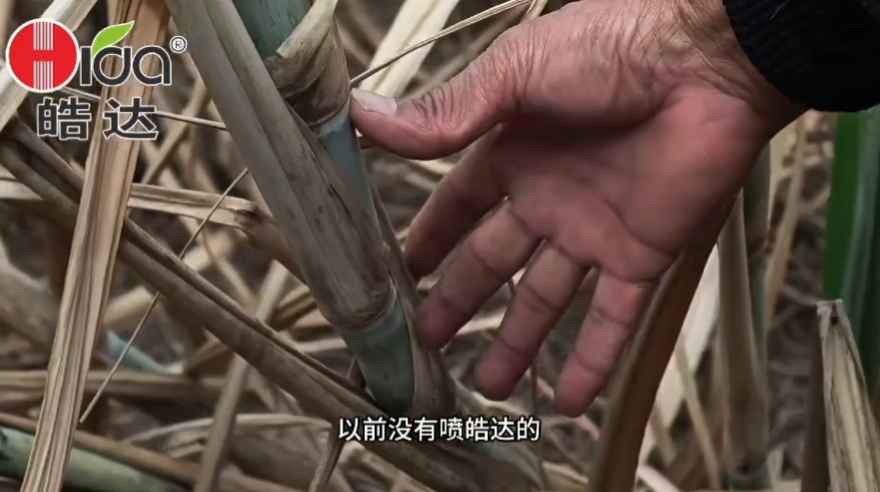通過梁總的介紹才知道,糖蔗在拔節初期就是常規管理沒有用皓達,碰上2024年廣西從9月底開始一直沒有下雨的干旱天氣,自家的糖蔗生長很不好(節間距短),又看到別家用了皓達的糖蔗長得那么高大粗壯,再不行動今年就白忙活了。于是10月中旬后梁總將自家糖蔗連續用飛防噴了2次皓達,結果是“立竿見影”,所以才看到糖蔗下部分節間距,上部分長這樣的“奇觀”,今年糖蔗產量在皓達的幫助下有了保障。