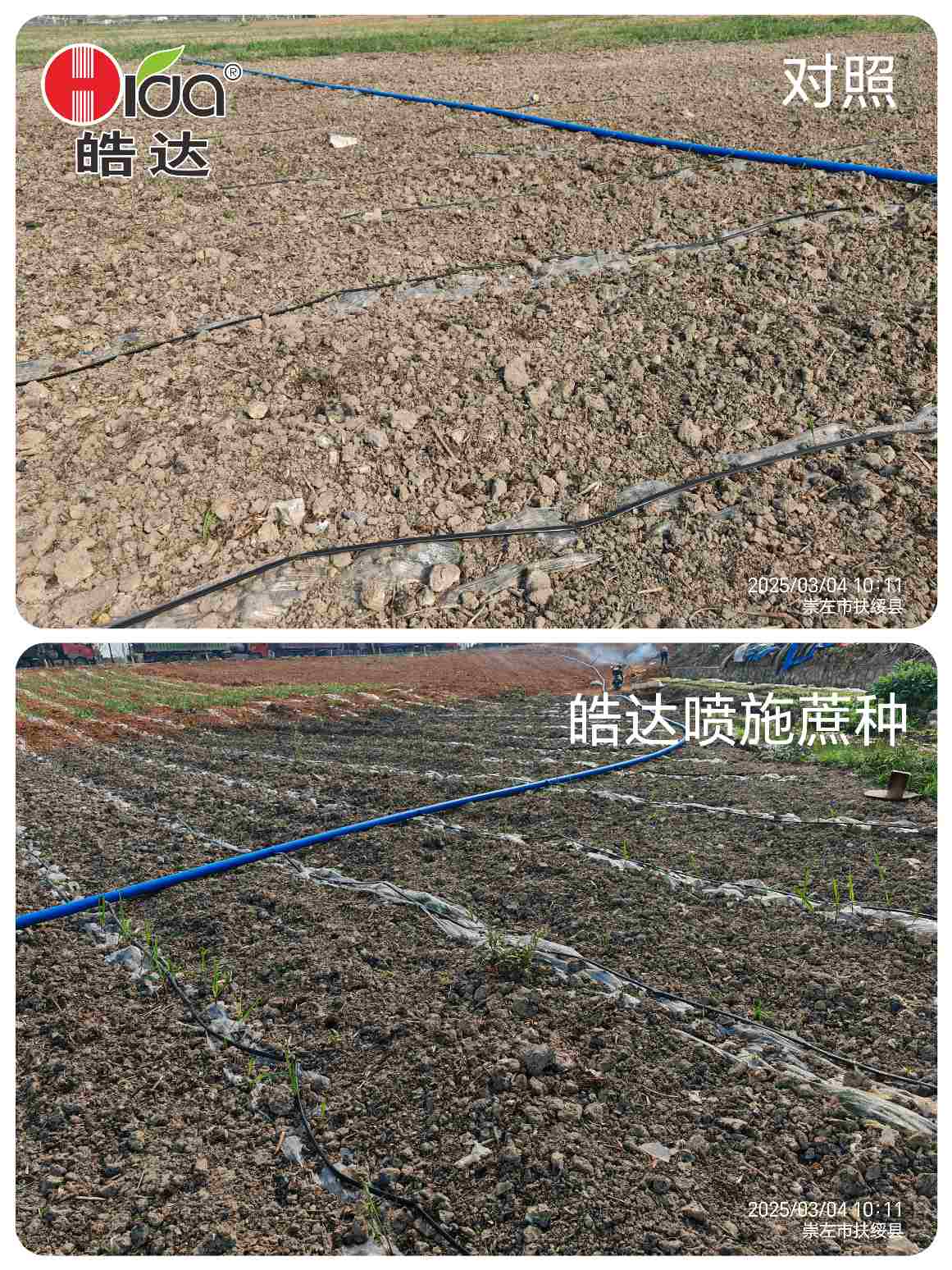 常規(guī)處理對照(上圖)的蔗種出苗稀疏,皓達(dá)處理(下圖)的蔗種出苗整齊 2025.3.4