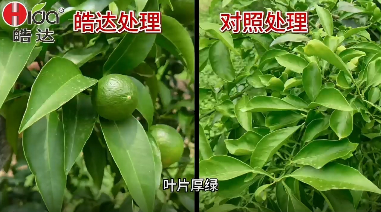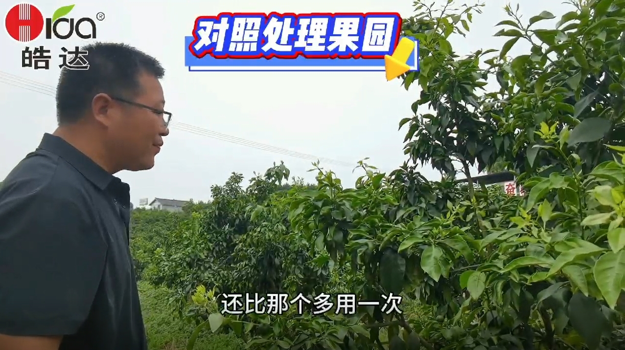 都是羅總同期種植的愛媛,皓達(dá)處理的愛媛葉片厚綠,果子又多又大與對(duì)照處理的愛媛新梢還沒完全老熟、果少又小形成鮮明的對(duì)比。