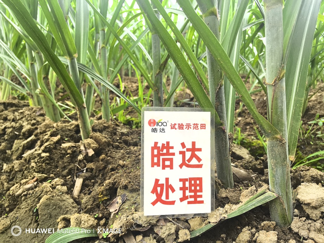 今年5月譚老板的甘蔗培土后繼續每畝用了2斤皓達+大量元素淋根,現在的葉片厚綠油亮,莖稈粗壯。