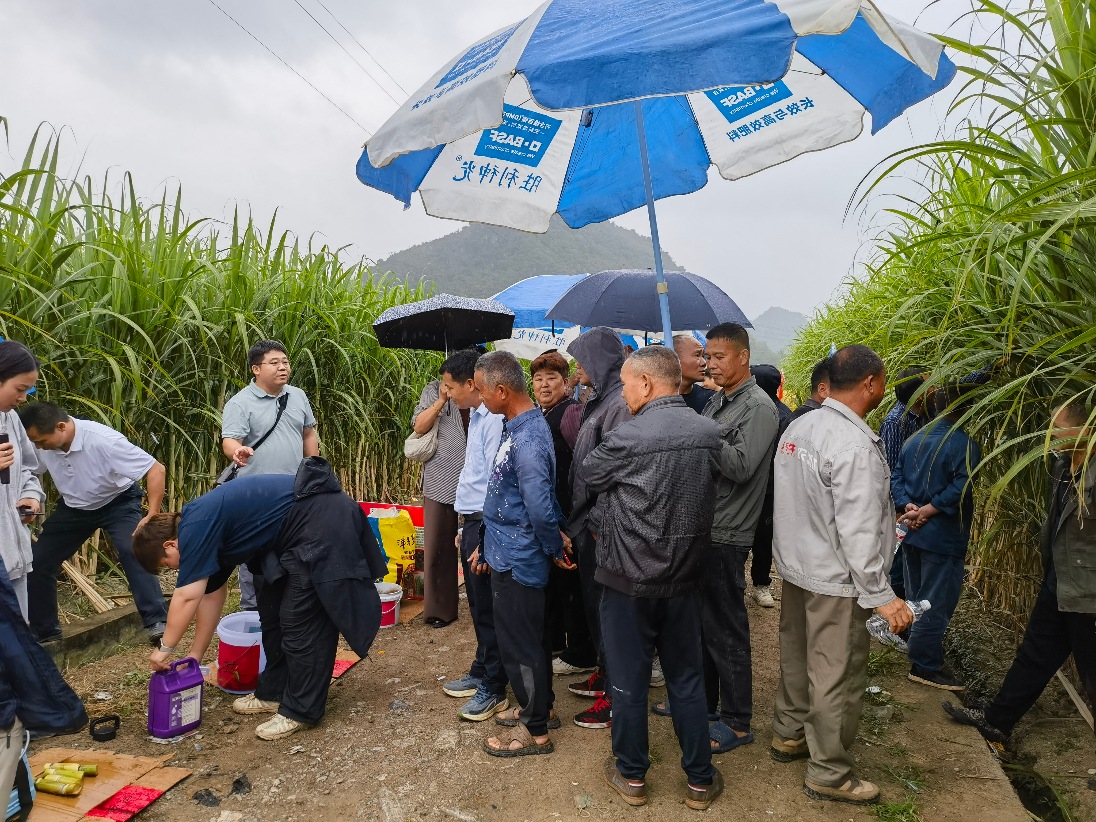 為了讓種植戶更直觀地掌握用法,工作人員在現場進行了實操演示——從用皓達肥料對復合肥的拌肥處理,到蔗種的浸泡方式,再到噴霧器噴施時的操作技巧,每一步都講解細致、動作規范。現場種植戶聽得認真,記得用心,有的拿出手機拍攝記錄,有的遇到疑問及時提問,互動氛圍十分熱烈。