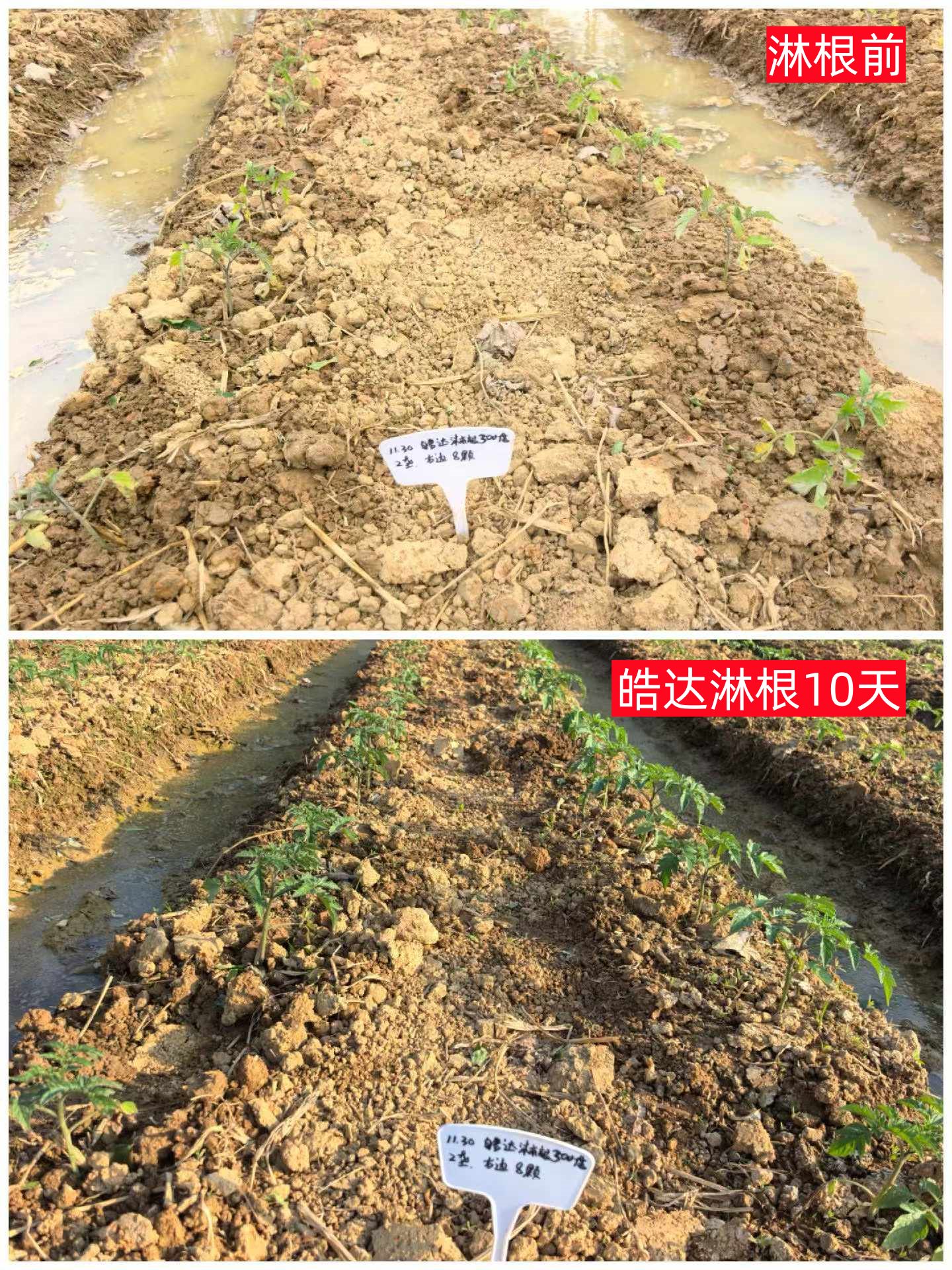 廣西桂平蒙圩鎮全老板移栽后的番茄緩苗慢、加之土壤板結、低溫霜凍造成黃苗嚴重,于2025年11月30日使用皓達300倍液定根水,12月9日(施用皓達定根水10天)回訪番茄緩苗成功、長勢興旺。