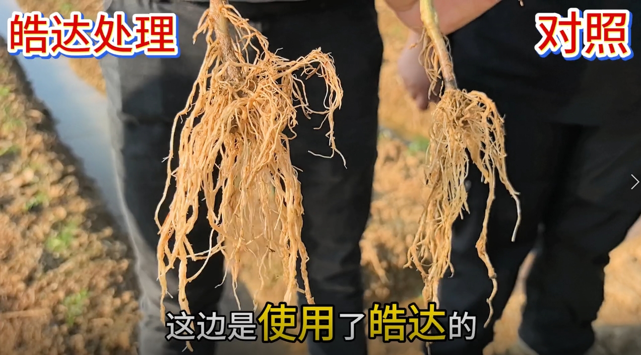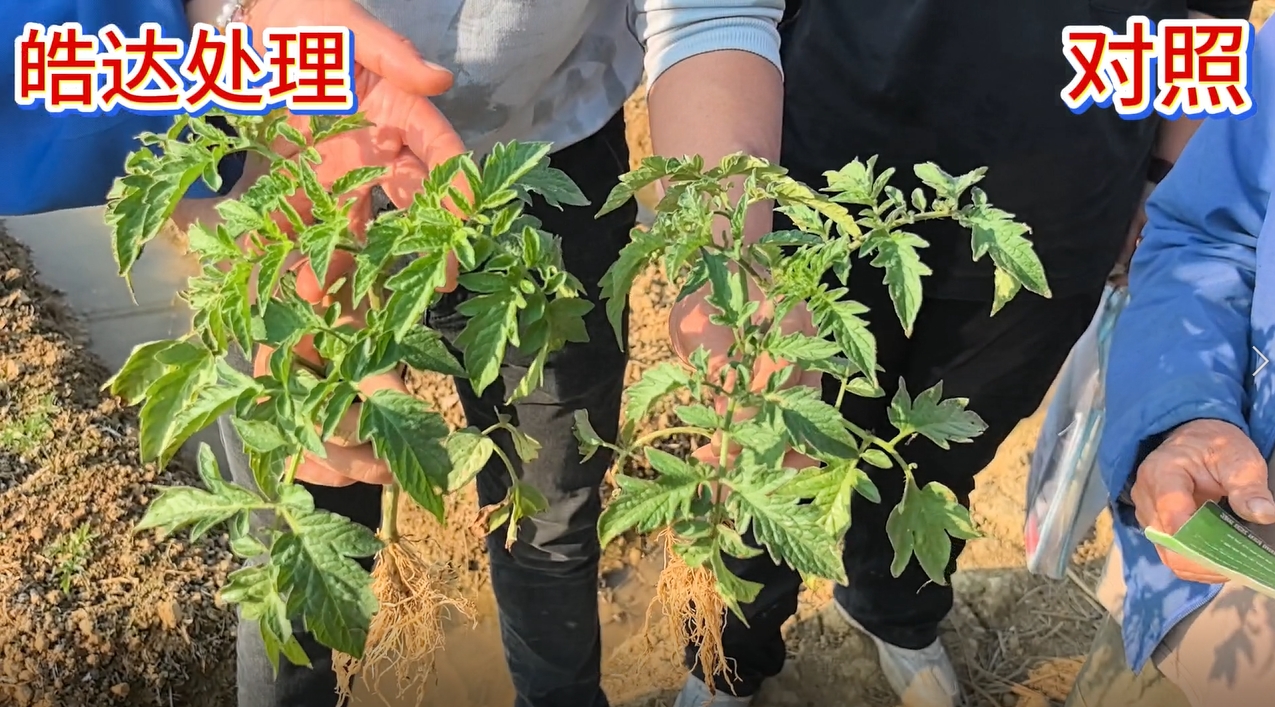 1、皓達處理的番茄根系較對照的更多更豐富。