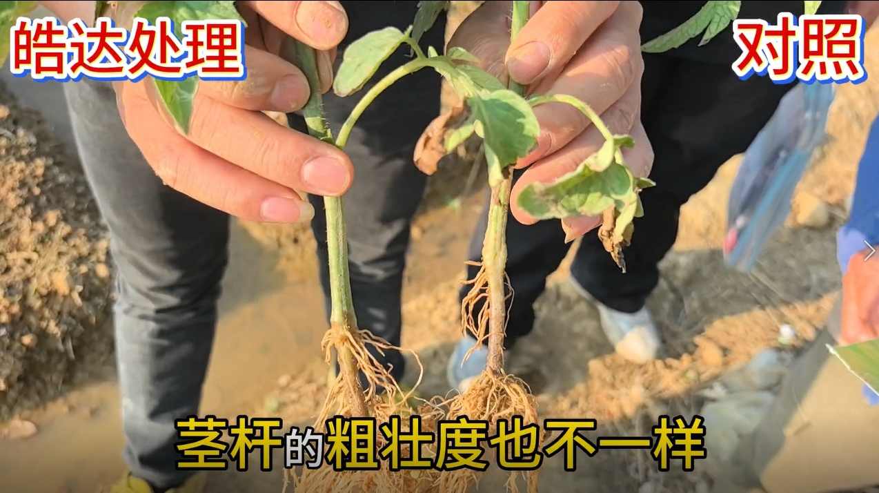 2、皓達處理的番茄莖稈較對照更粗壯。